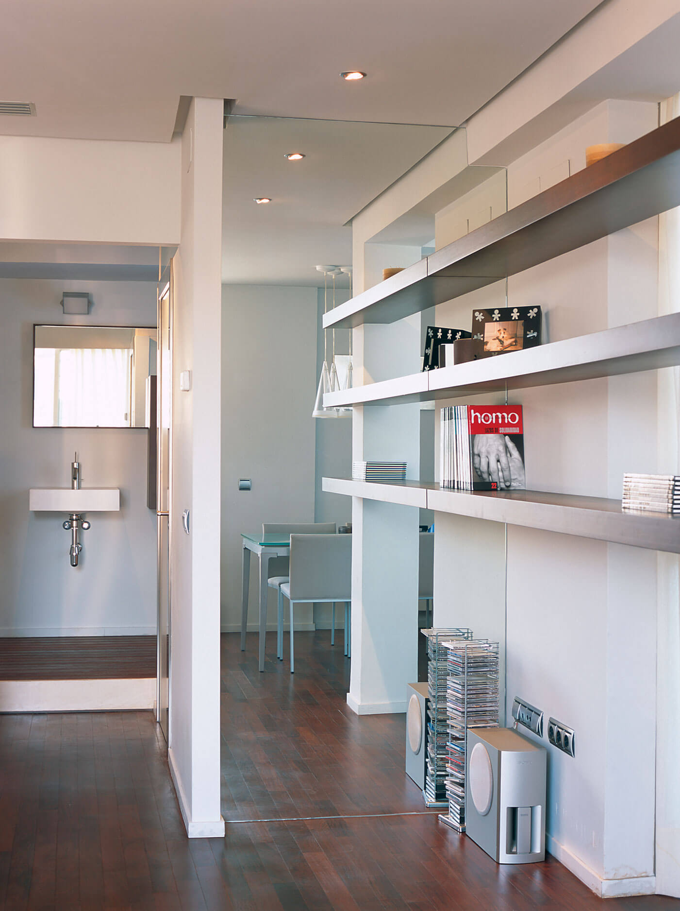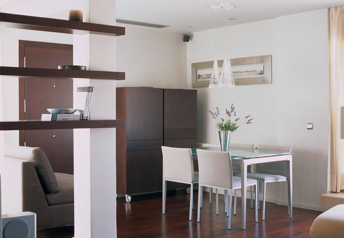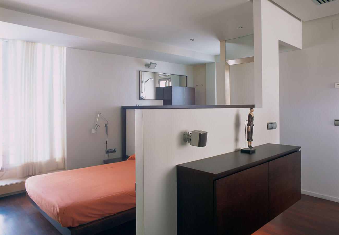 Reforma integral de ático en Valencia transformando un espacio con déficit de iluminación natural y con una distribución muy fragmentada, en un espacio luminoso adaptado a las necesidades del cliente con una distribución marcadamente abierta . Los tabiques a media altura son el recurso utilizado para organizar el espacio. El mobiliario y la iluminación han sido concebidos para buscar su máxima integración arquitectónica.