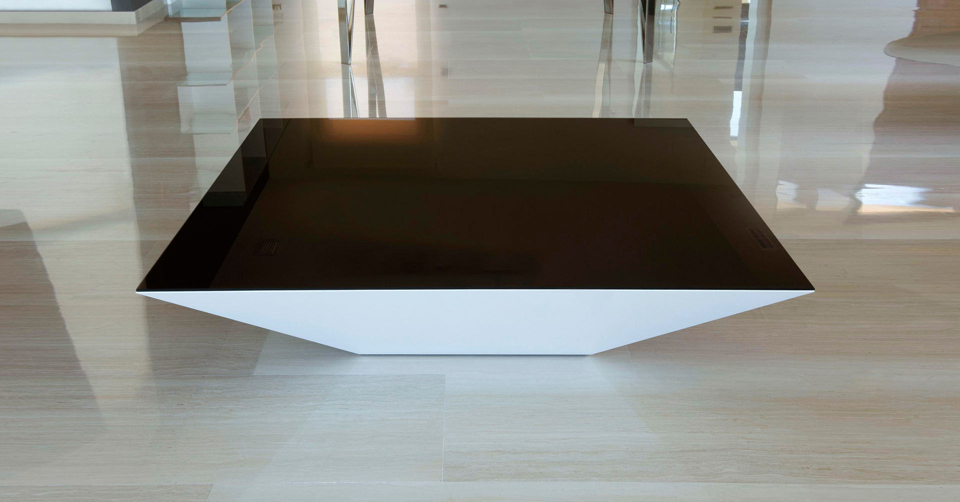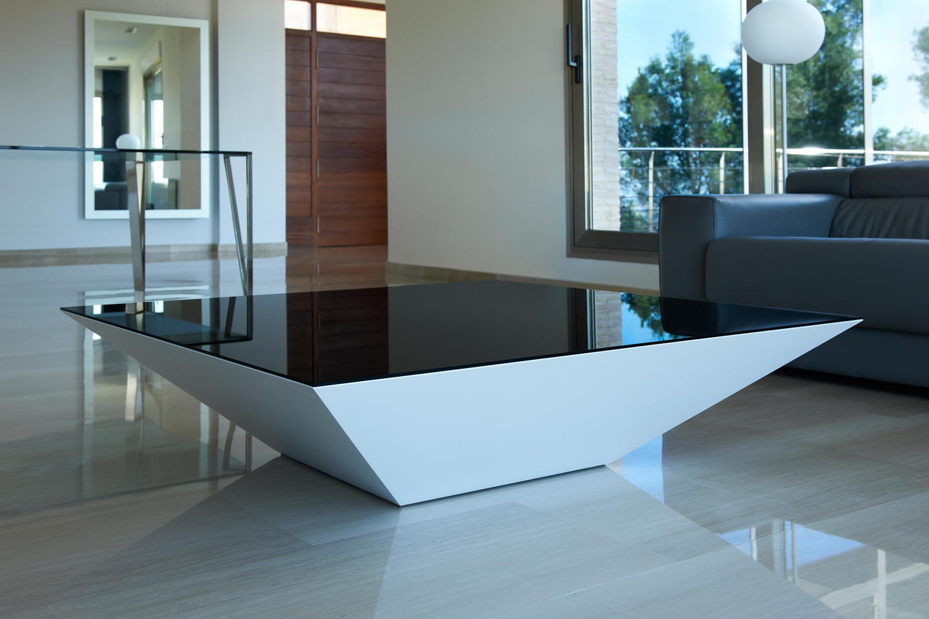 Pyramid es una mesa de centro formada por un volumen atamborado realizado con tablero MDF lacado o chapado en madera, que tiene forma de tronco piramidal invertido,  con su cara superior cubierta por una tapa de vidrio termolacado. Esa importante reducción de la sección en su parte inferior aligera notablemente su volumetría y genera unas aristas inclinadas que le confieren un carácter propio, geométrico y escultural.